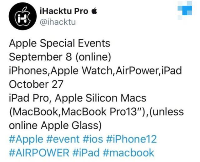 유명한 외국 트위터 ihacktu에 따르면 7월 25일 최신 뉴스에 따르면 iPhone 12는 예정대로 출시될 거라고 합니다. 9월 애플 컨퍼런스에서 Apple은 4 개의 iPhone12, iPad Apple Watch 및 이미 전부터 몇 번의 출시를 시도했던 Airpower 에어파워를 발표합니다.