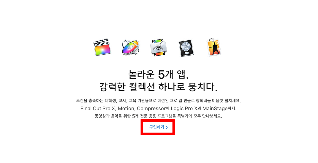애플은 공식 홈페이지에서도 교육 할인 스토어를 운영하고 있습니다. 교육 할인이라고 해서 학생만 할인해주는 건가 싶지만 구매 시 따로 인증절차는 필요하지 않습니다. 교육용 프로 앱 번들에는 영상을 위한 파이널 컷 프로, 모션, 컴프레서가 포함되어있고 음악을 위한 앱으로는 로직과 메인 스테이지가 포함되어 있습니다. 개별적으로 구매 시 모두 비싼 제품입니다.