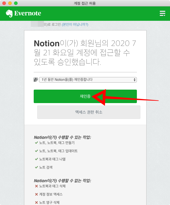 먼저 사용하던 에버노트 계정을 로그인해줍니다. 저는 이미 인증을 받은 상태라 재인증이 나오지만 처음하는 유저는 인증하기 버튼이 활성화 되실겁니다. 인증과 동시에 에버노트의 모든 폴더와 페이지들이 자동으로 들어옵니다.